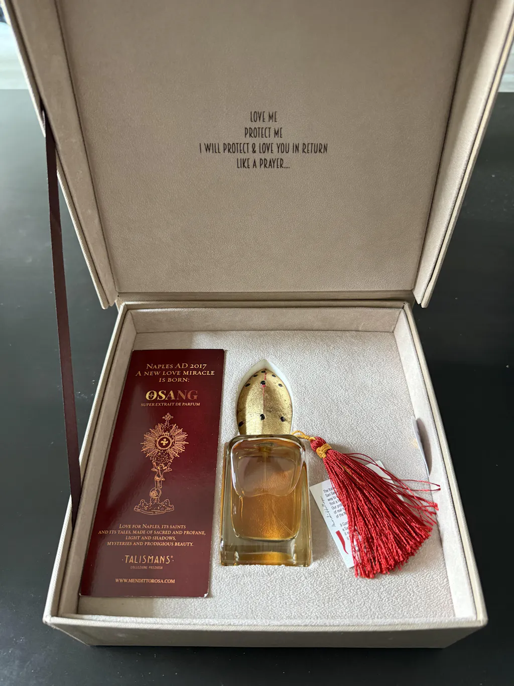 The miracle slowly unfolds from sunlit flowers through a sea of honey and glorious fenugreek, stirring our hunger into clouds of swirling darkness, golden hope and cindered skies. A perfume of darkness that slowly explodes into delirious, mysterious light, a Talisman of blood, seething with shadows and burning magic.